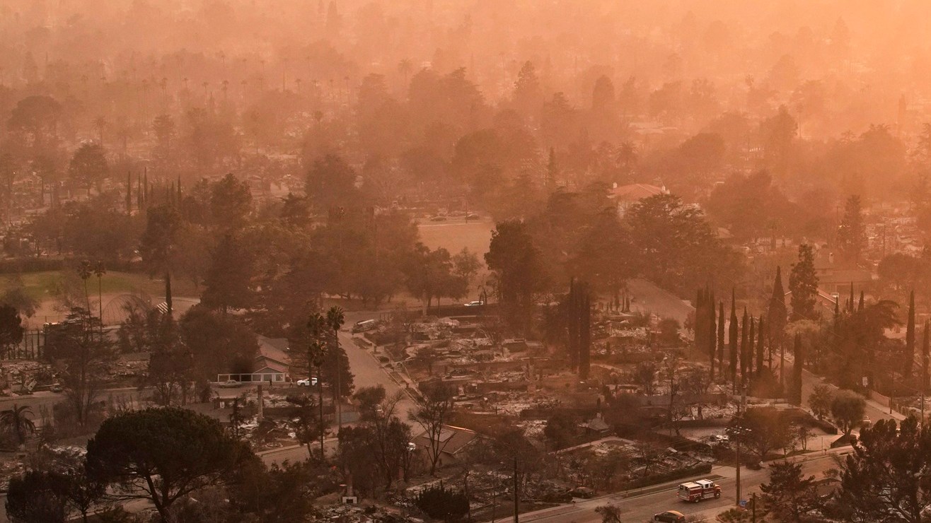 El humo sobre un barrio devastado por el incendio de Eaton, el jueves 9 de enero de 2025, en Altadena, California. Crédito: John Locher | AP