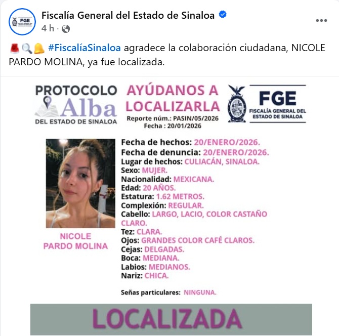“#FiscalíaSinaloa agradece la colaboración ciudadana, NICOLE PARDO MOLINA ya fue localizada”, destaca el mensaje de las autoridades publicado en su cuenta de Facebook.