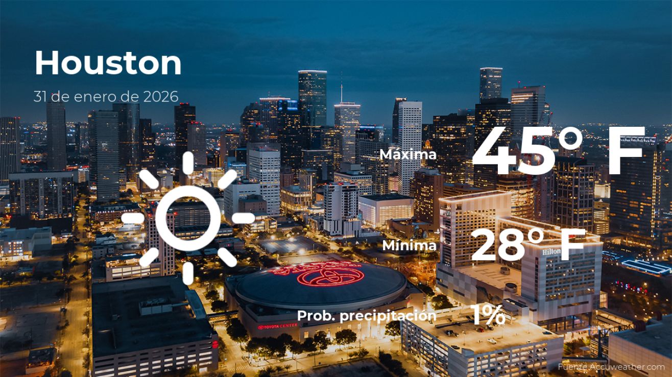 El clima en Houston, Texas, para este sábado 31 de enero vendrá con cielos sin presencia de nubes. De acuerdo al parte meteorológico de AccuWeather, la temperatura alcanzará los 45 grados Fahrenheit (7ºC) de máxima durante el día, mientras que la temperatura más baja se registrará por la noche 28 grados Fahrenheit (-2ºC) de mínima.