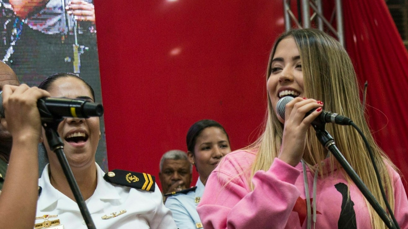 Daniela Cabello canta con oficiales de la fuerza aérea venezolana, durante el programa semanal de su padre, Diosdado Cabello. Crédito: Rodrigo Abd | AP