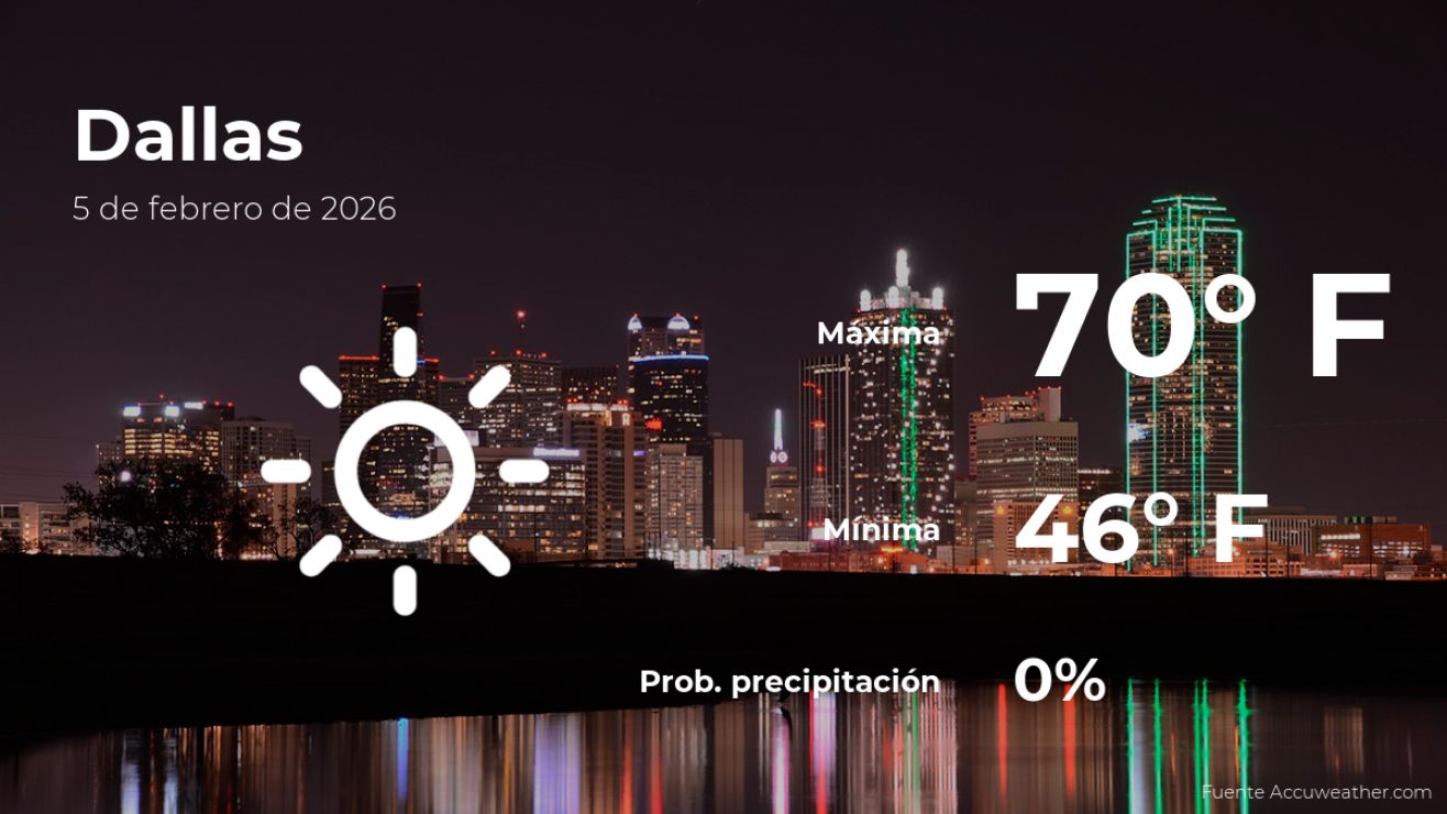 En cuanto al clima en Dallas mañana, el pronóstico indica que tendremos cielos sin nubes. Las temperaturas oscilarán entre los 45 y los 79 grados Fahrenheit (7 y 26 grados Celsius).