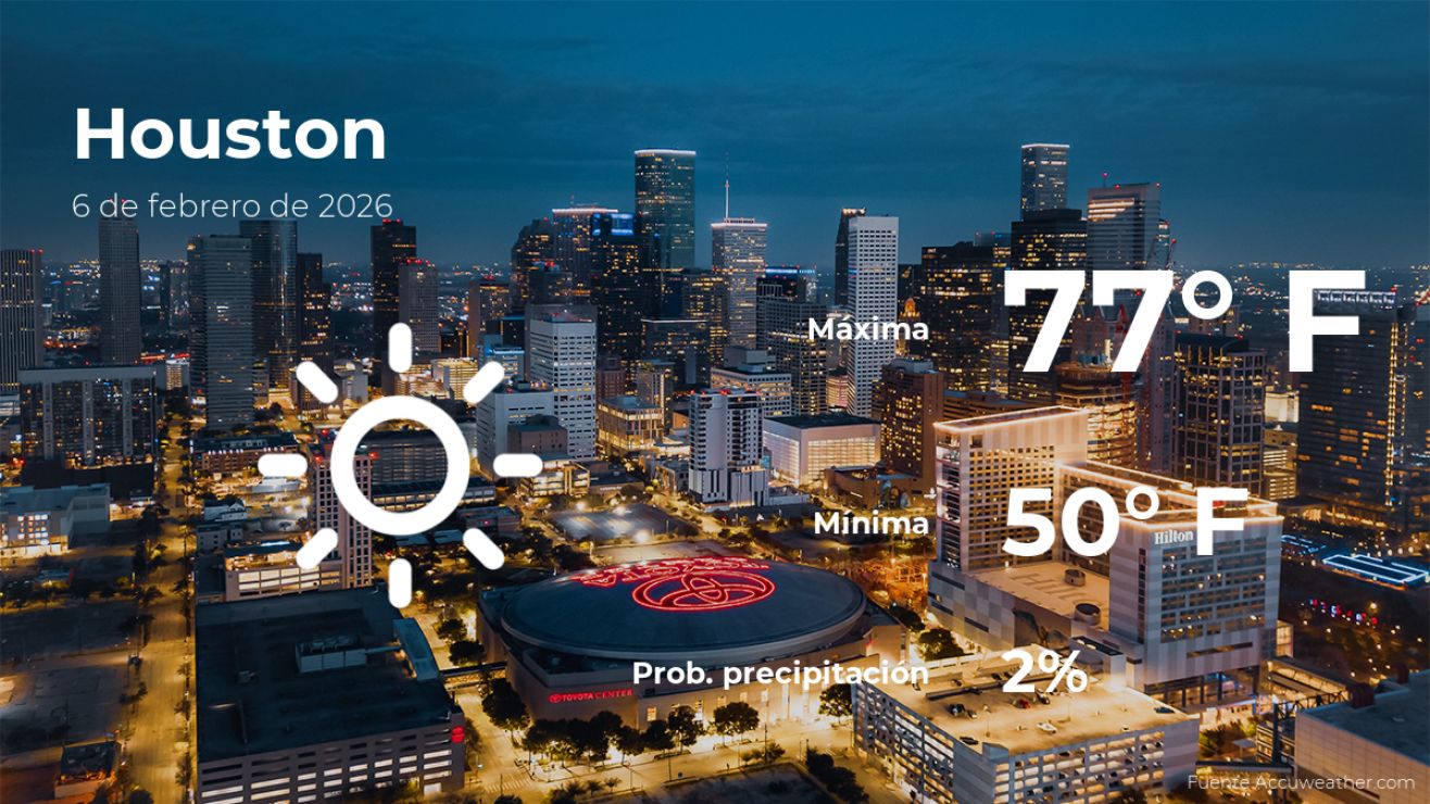 El clima en Houston, Texas, para este viernes 6 de febrero llegará con cielos despejados. De acuerdo al parte meteorológico de AccuWeather, la temperatura aumentará hasta los 77 grados Fahrenheit (25ºC) de máxima durante el día, mientras que durante la noche ésta descenderá hasta los 50 grados Fahrenheit (10ºC) de mínima.