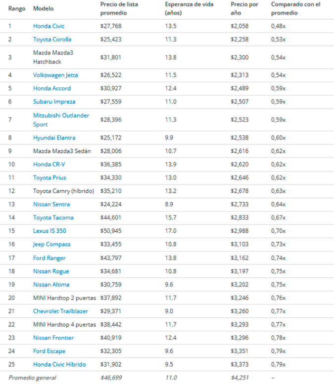 Según iSeeCars, el precio promedio de un auto nuevo en Estados Unidos es de $46,699 dólares, con una vida útil estimada de 11 años. Esto implica un costo anual de $4,251 dólares por año de uso, una cifra considerablemente más alta que la de los modelos mejor posicionados del ranking.