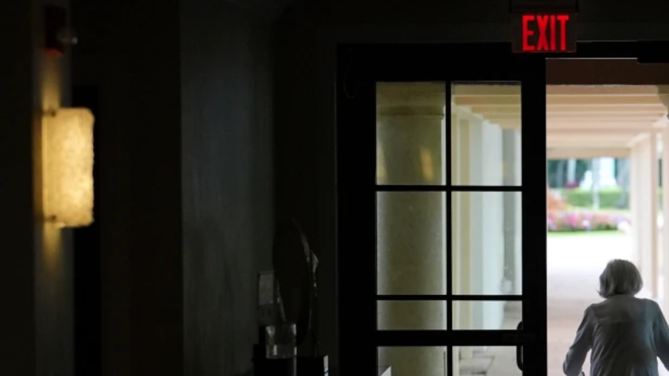 Una señora utiliza una andadera al salir de un edificio de vida asistida en Toby and Leon Cooperman Sinai Residences, en Boca de Ratón, Forida. Crédito: Rebecca Blackwell | AP