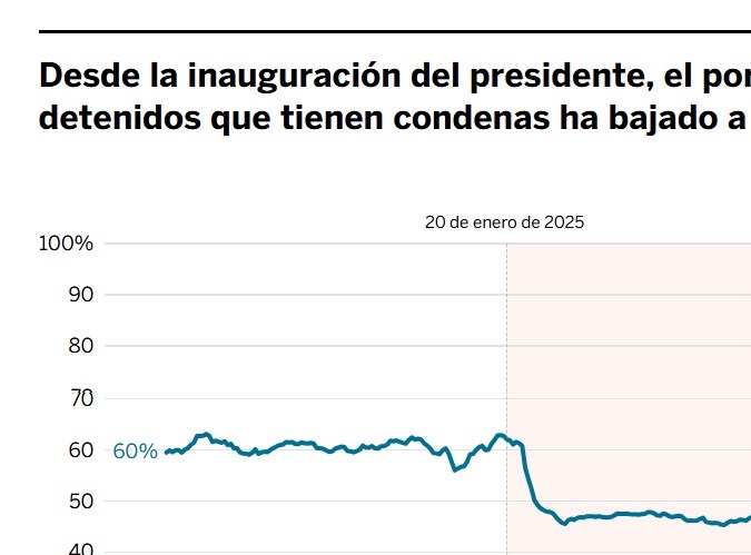 El aumento en el número de detenciones responde a los mayores arrestos de personas que no tienen condenas penales o que han cometido solo un delito no violento. Mientras tanto, el porcentaje de arrestos de personas condenadas por delitos violentos va en dirección opuesta. El porcentaje de nuevas detenciones de personas condenadas por delitos violentos ha bajado estrepitosamente de un 16 por ciento en las dos semanas anteriores a la inauguración del presidente Trump a un 6 por ciento en las dos primeras semanas de octubre de 2025.