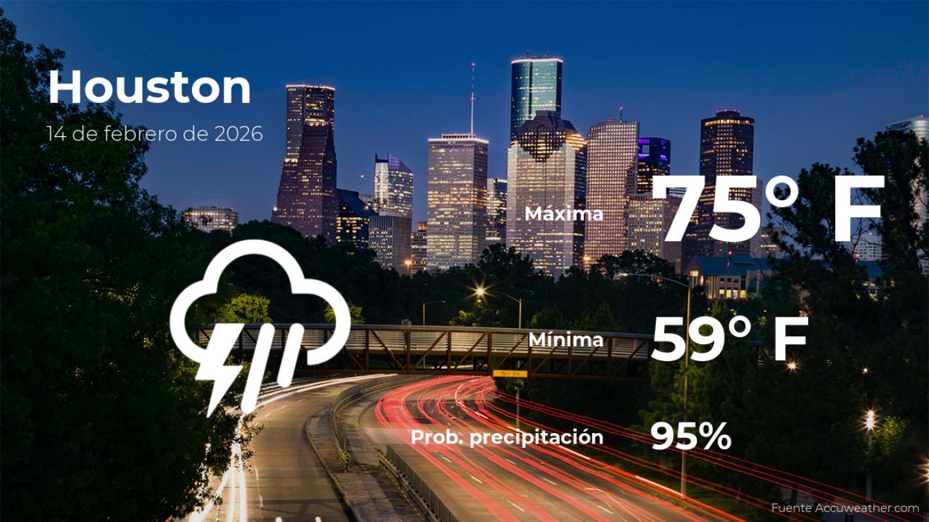 El clima en Houston, Texas, para este sábado 14 de febrero se desarrollará con cielos prácticamente cubiertos. De acuerdo al parte meteorológico de AccuWeather, la temperatura se incrementará hasta un total de 75 grados Fahrenheit (24ºC) de máxima durante el día, mientras que la temperatura más baja se registrará por la noche 59 grados Fahrenheit (15ºC) de mínima.