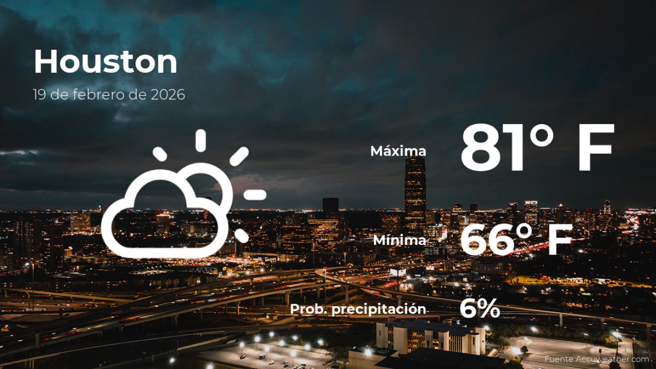 El clima en Houston, Texas, para este jueves 19 de febrero tendrá movimientos de nubes y presencia y ausencia de claros. De acuerdo al parte meteorológico de AccuWeather, la temperatura se incrementará hasta un total de 81 grados Fahrenheit (27ºC) de máxima durante el día, mientras que a la noche se registrará la temperatura más baja, con 66 grados Fahrenheit (19ºC) de mínima.
