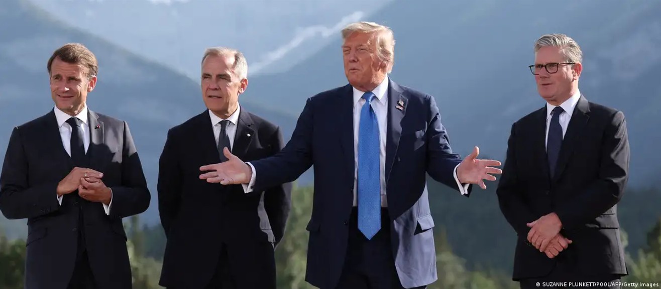 De izquierda a derecha, el presidente francés Emmanuel Macron, el primer ministro canadiense Mark Carney, el presidente estadounidense Donald Trump y el primer ministro británico Keir Starmer en una cumbre del G7 en Alberta, Canadá (16.06.2025) Crédito: SUZANNE PLUNKETT/POOL/AFP/Getty Images | copyright