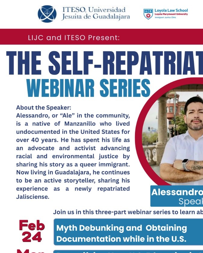 Alessandro ha sido invitado para participar con su testimonio en los Webinars The Self-Repatriation organizados por la Loyola Law School de Loyola Marymount University en Los Ángeles y el ITESO, la Universidad Jesuita de Guadalajara para brindar herramientas a los inmigrantes que deciden regresar a México.