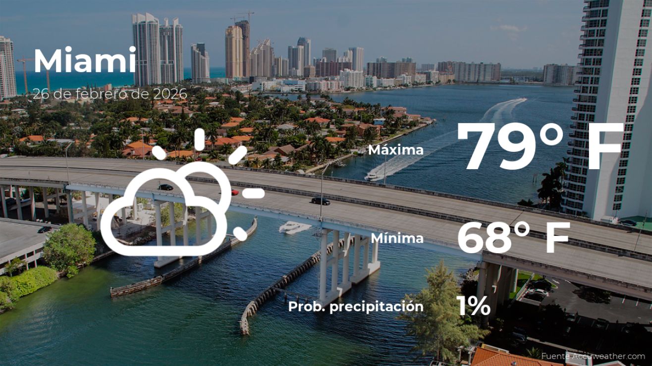 Conoce cómo estará el tiempo en Miami, Florida, para hoy jueves 26 de febrero. Antes de salir de tu casa, descubre el pronóstico meteorológico y las condiciones climáticas más relevantes para este día.