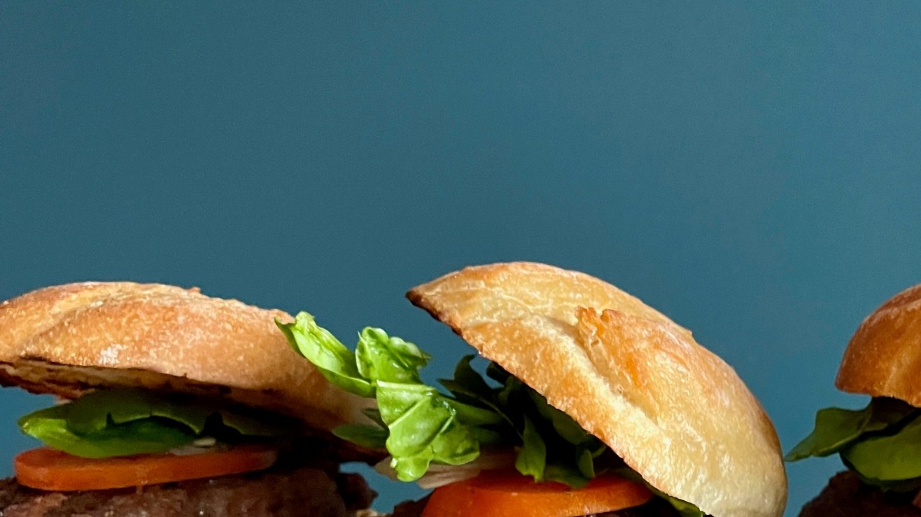 Hamburguesas caseras de carne magra servidas sobre tabla de madera. Crédito: Maleo Photography | Shutterstock