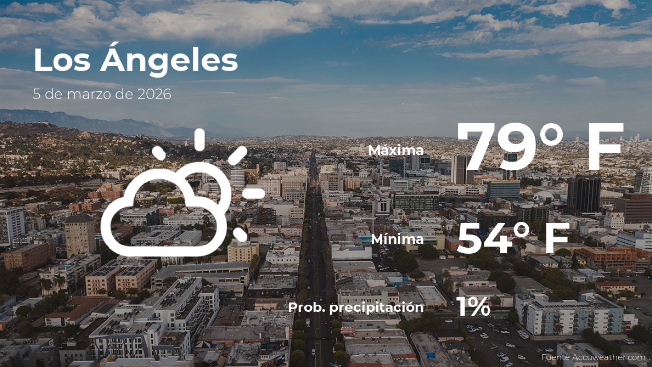 Conoce cómo estará el tiempo en Los Ángeles, para hoy jueves 5 de marzo. Antes de salir de tu casa, descubre el pronóstico meteorológico y las condiciones climáticas más relevantes para este día.