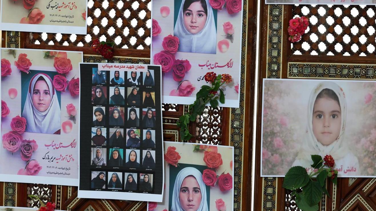 Fotografías de algunas de las niñas de la escuela primaria Shajarah Tayyebeh que fallecieron en el atentado con misil de EE.UU, en Minab, al sur de Irán. Crédito: Mohamed Messara | EFE