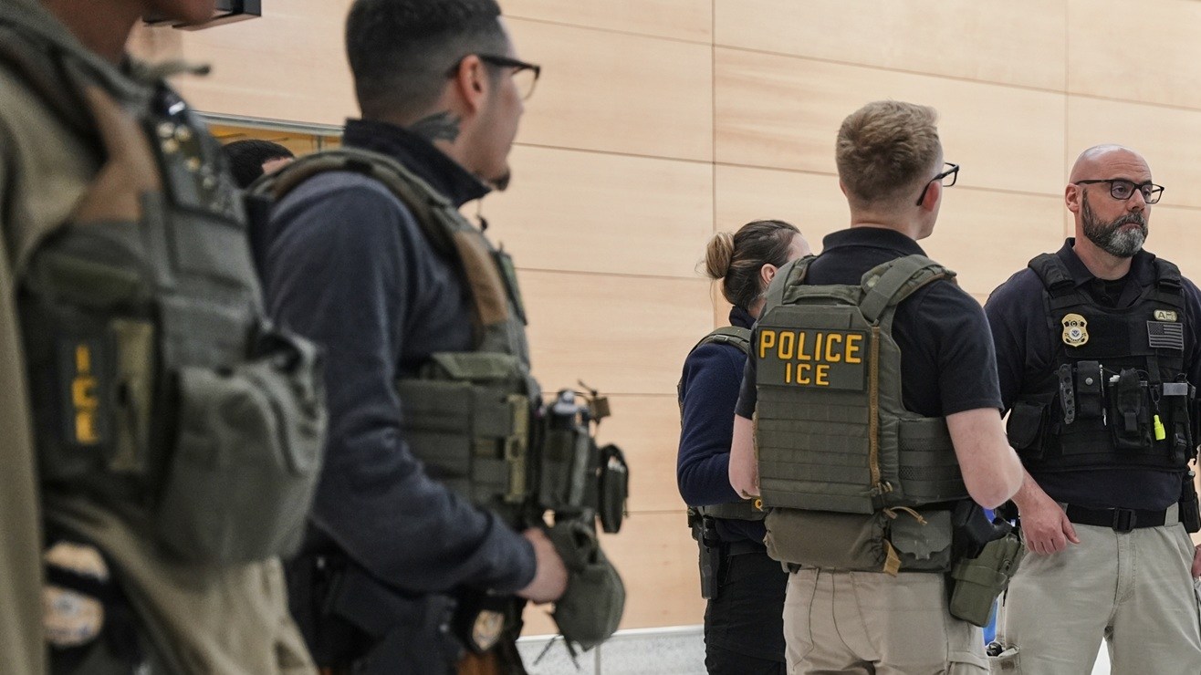 Agentes federales de inmigración son vistos en el Aeropuerto Internacional Newark Liberty, en Newark, Nueva Jersey. Crédito: Angelina Katsanis | AP