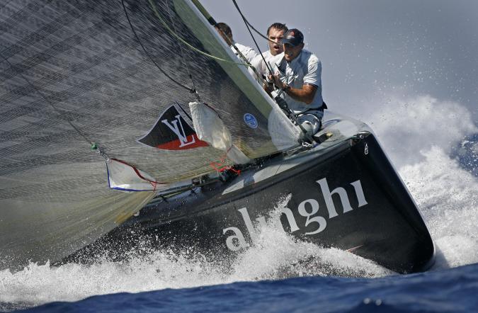 El Alinghi suizo lideró al Emirates Team New Zealand en el séptimo día de carreras de la 32.ª America’s Cup en Valencia, el 3 de julio de 2007. En un emocionante final, los suizos vencieron a los kiwis hasta la línea para ganar la serie 5-2 y retener la America’s Cup. (MIGUEL RIOPA/AFP via Getty Images)