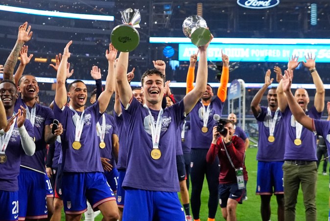 Los jugadores de Estados Unidos celebran en el podio después de una victoria sobre México en la final de la Liga de Naciones de la CONCACAF, el domingo 24 de marzo de 2024, en Arlington, Texas. Crédito: Julio Cortez | AP