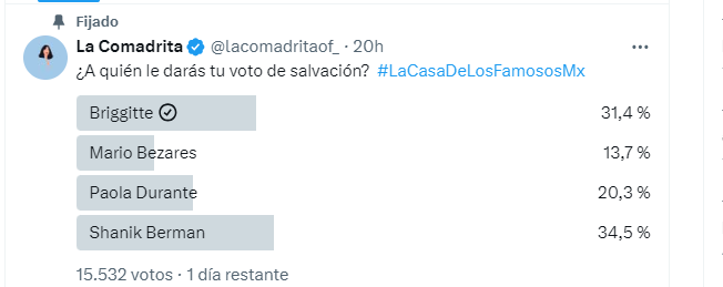De acuerdo a la encuesta de ‘La Comadrita’, Shanik Berman tiene la delantera en las encuestas con 34.5%, de cerca la sigue Briggitte Bozzo 31,4 %, en el tercer lugar está Paola Durante con 20, 3 % y, en el último puesto, Mario Bazares con 14 %.