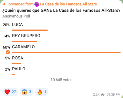 Con la salida de Méndez, Caramelo se posiciona en el primer lugar de las encuestas con 40 % de los votos. En el segundo lugar destaca Luca Onestini con 20 %, le sigue Rey Grupero con 12 %, después Rosa y en el último lugar, Paulo Quevedo.
